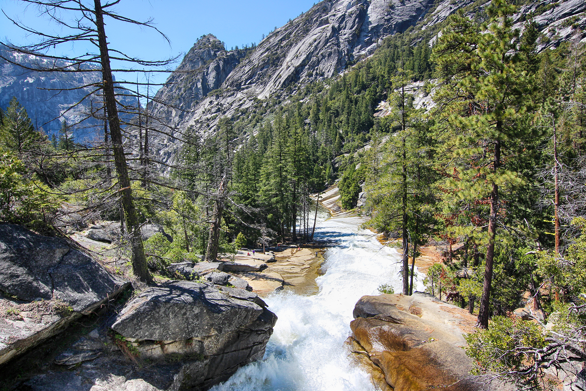 離開 Vernal Fall 上游繼續向東行,就開始進入 Nevada Fall Trail 嘅路段嘞,喺呢段山徑起步點側邊有一個名為 Emerald Pool 嘅水池,我哋喺春天溶雪季節嚟到呢度就見到個激流澎湃咁嘅場面喇,不過到咗夏天呢度嘅水流平靜返嗰陣,就會有途經嘅遊人喺呢度玩水游泳。