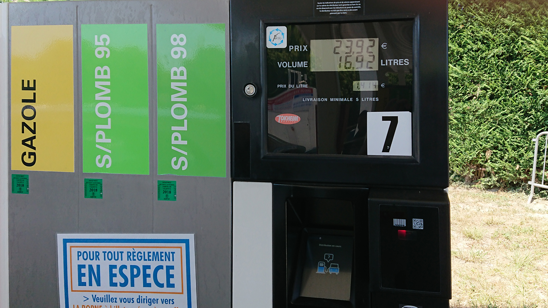 唔識法文嘅我哋一直冇為意原來有部可以收紙幣出飛嘅現金售票機,撳呢部機就可以出到一張上面印咗條碼嘅入油券,部入油機除咗可以掃瞄信用卡之外亦有另一個位可以掃瞄呢張飛上面嘅條碼,掃咗飛部機就會出選單俾我哋揀用邊支油槍入油。
